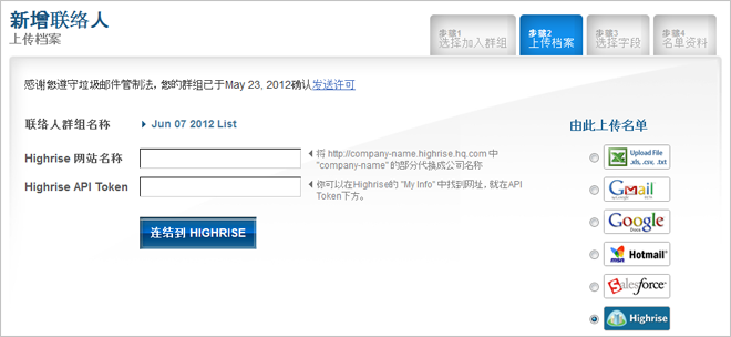 此整合功能让你将Highrise CRM的联络人汇入新的或既有的Benchmark联络人群组。操作简易而且不需任何下载安装作业。