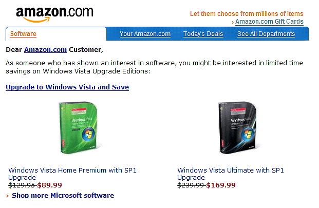 Ejemplo: Con enlaces en azul incluyendo los que conducen a otros acuerdos, la cuentas individuales así como los productos se destacan, Amazon utiliza vínculos para mostrar a los proveedores de servicio de email que cada diseño se va a alguien que no es solamente un suscriptor, si no alguien que tiene una cuenta con la compañía.